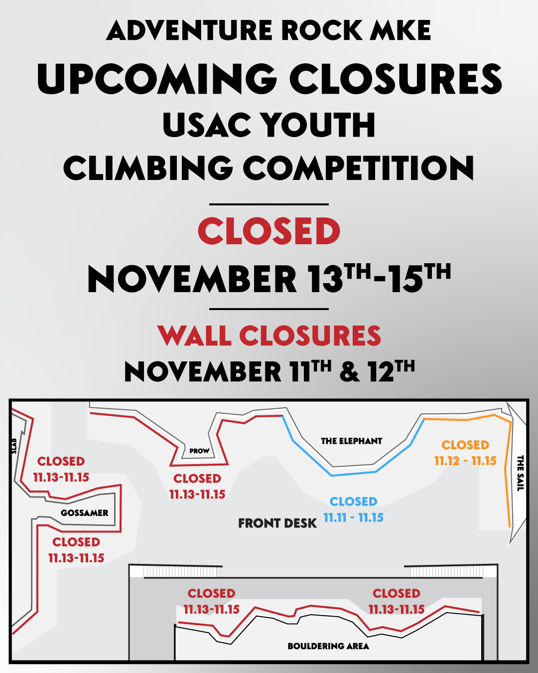 Friday (10/10): All bouldering CLOSED. Spray wall, training boards, yoga, & fitness OPEN.
